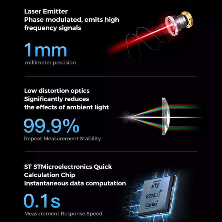 يمكن لهذه الأداة حساب المسافة تلقائيًا بين 0.03 متر إلى 40 متر وحساب المساحة بدقة ± 2 مم.