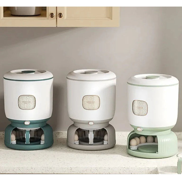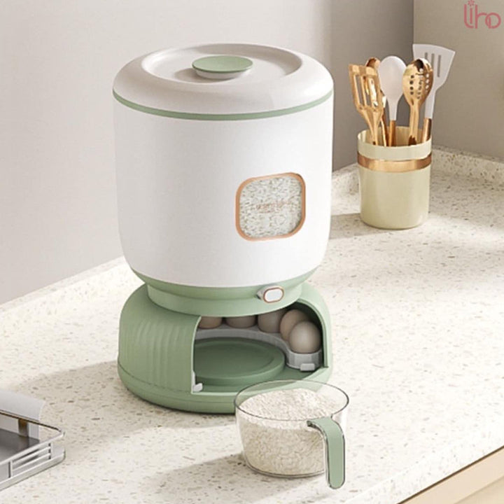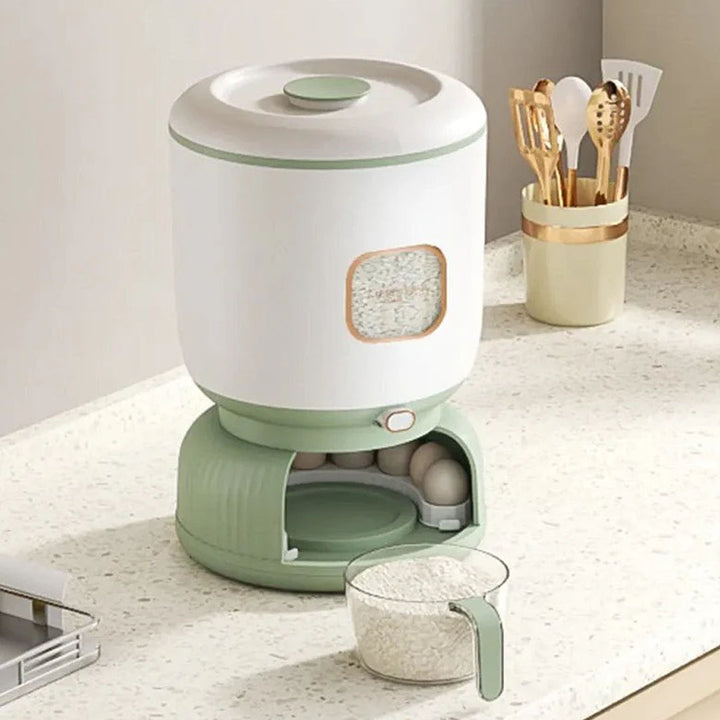 Rice Dispensing Container with Lid and Rotating Measuring Cup with Airtight Egg Storage 10kg Capacity