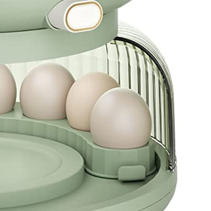 Unique rotating egg storage and handy cup for easy cereal retrieval.