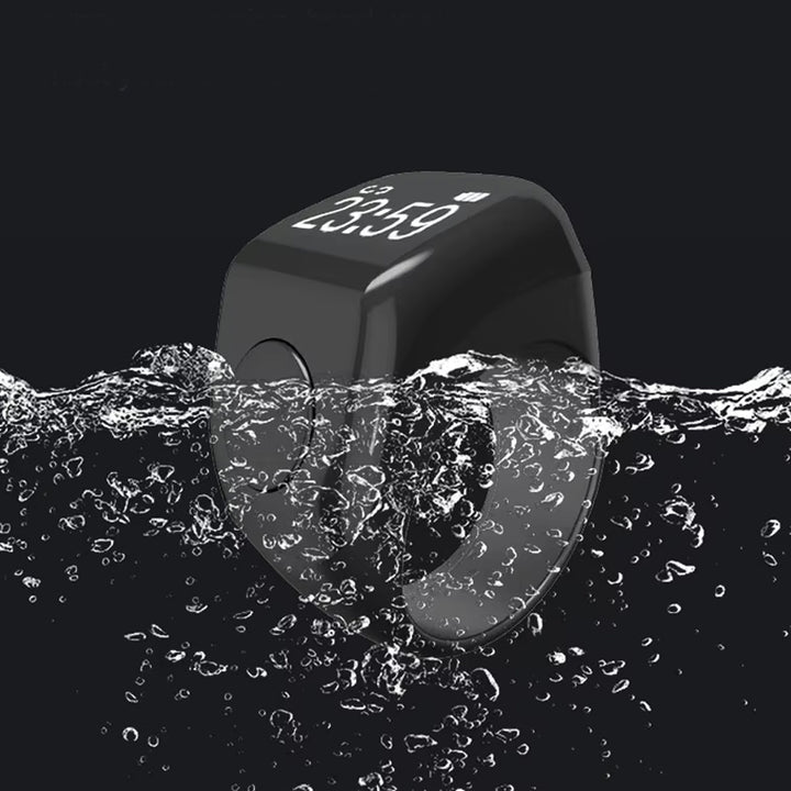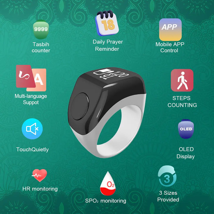 A ring that combines a Tasbeeh counter, a watch, a blood oxygen and pressure meter, and a step counter, with an OLED screen and water resistance, to give you innovative functions and an elegant design.